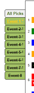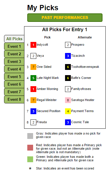 1. Picks are made through the tabbed interface on the left. Race tabs change colors as selections are made for each race. Players may navigate through multiple entries in a single contest quickly via a drop down menu.