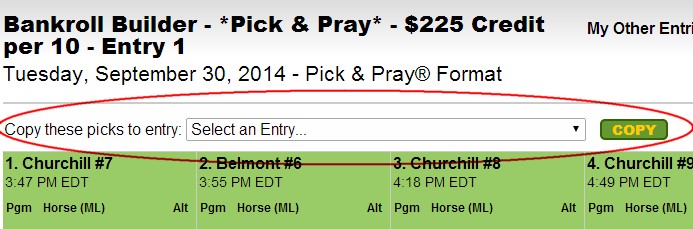 Players may now copy picks from one entry to another entry that is run under the same contest schedule (i.e., uses the same races). This is a useful, time-saving feature for players that play multiple entries in multiple contests. To access the copy feature, please follow the instructions below: