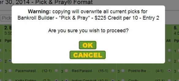 (2) If you copy picks from an entry that contains NO SELECTION into another entry that already contains a pick for that particular race, the existing pick in the entry that you are copying TO will remain. This is intended to make sure that players are not accidentally stuck with NO SELECTION if an error has been made by the player.